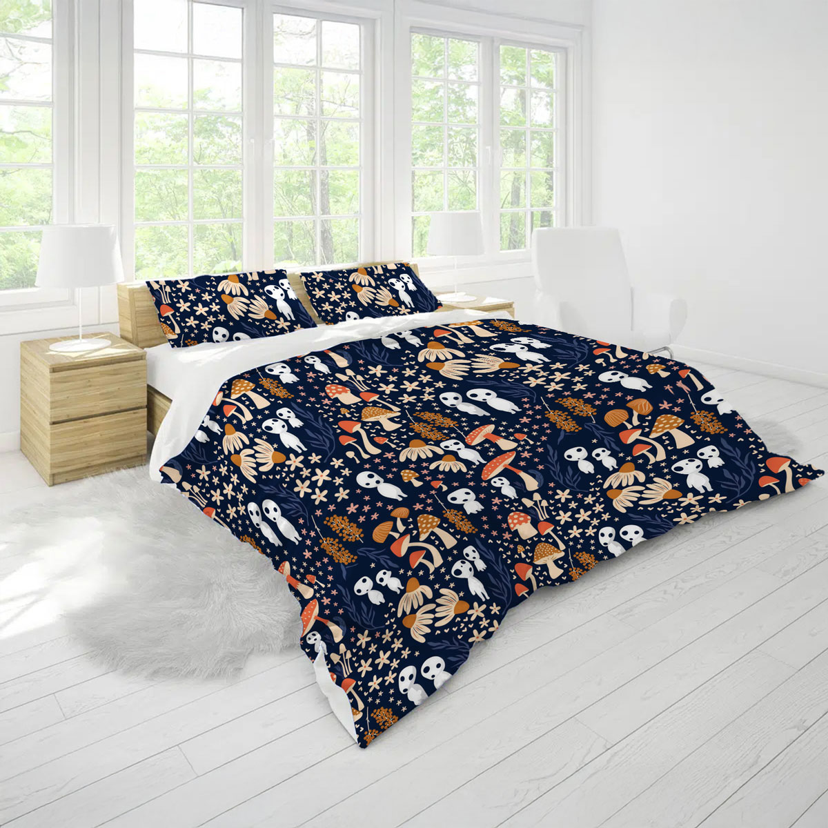 Bring calm forest vibes to your room with this Forest Kodama & Mushroom Bedding Set from Ghibli Nest Store. Soft, lightweight brushed polyester delivers year-round comfort. Shop now.