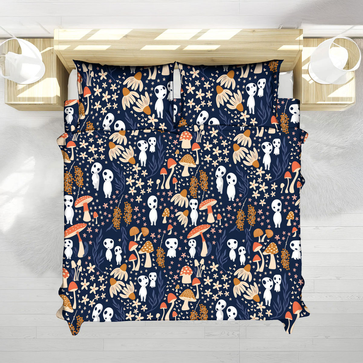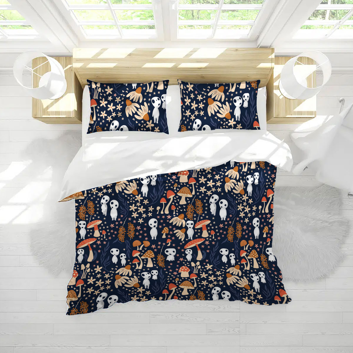 Bring calm forest vibes to your room with this Forest Kodama & Mushroom Bedding Set from Ghibli Nest Store. Soft, lightweight brushed polyester delivers year-round comfort. Shop now.