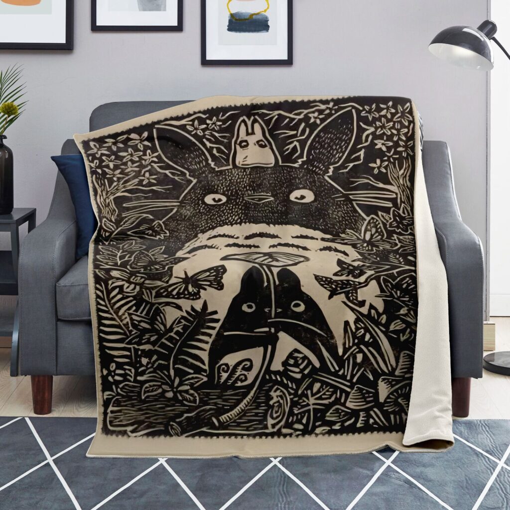 • Theme: Totoro Forest Woodcut Art Sherpa Blanket — classic handcrafted-style illustration curated by Ghibli Nest Store