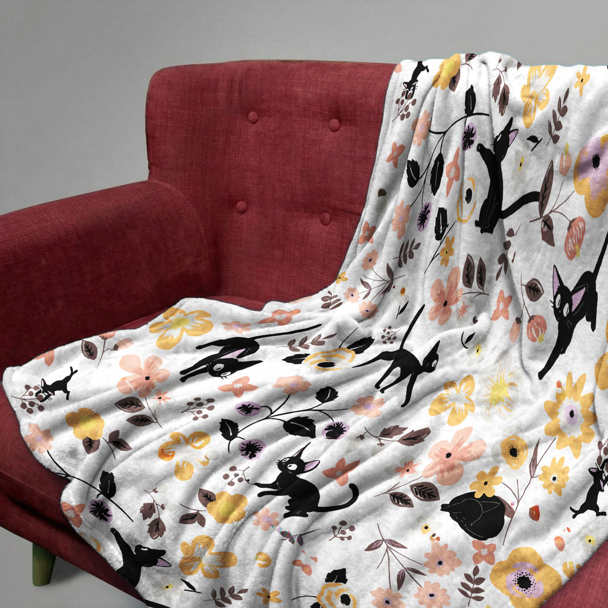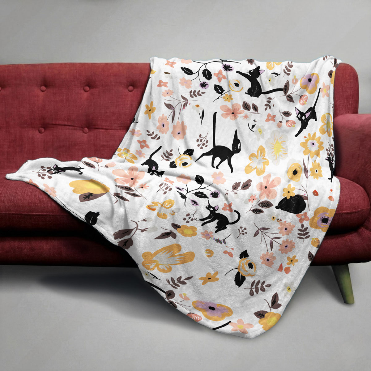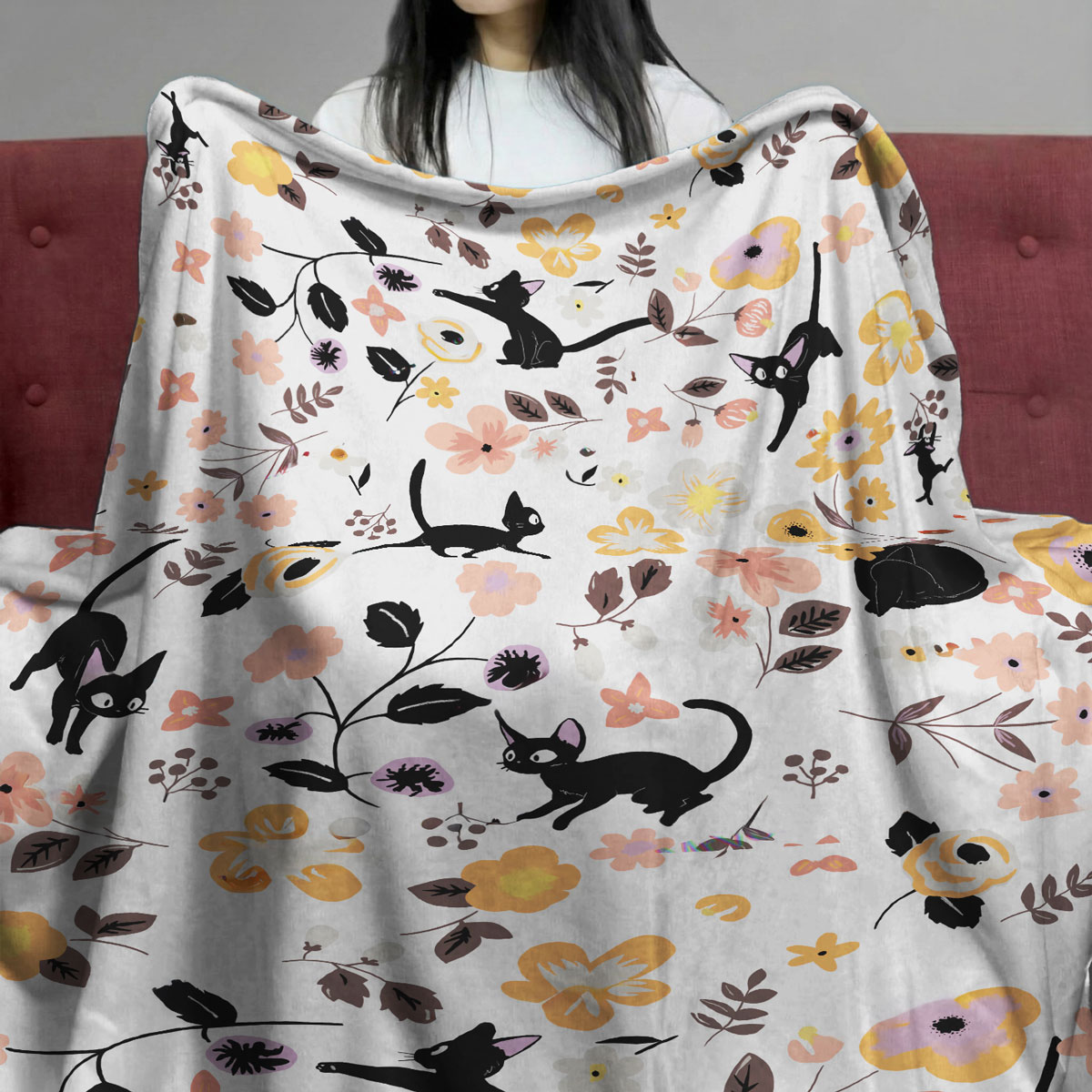Jiji Black Cat Floral Pattern Cozy Plush Blanket