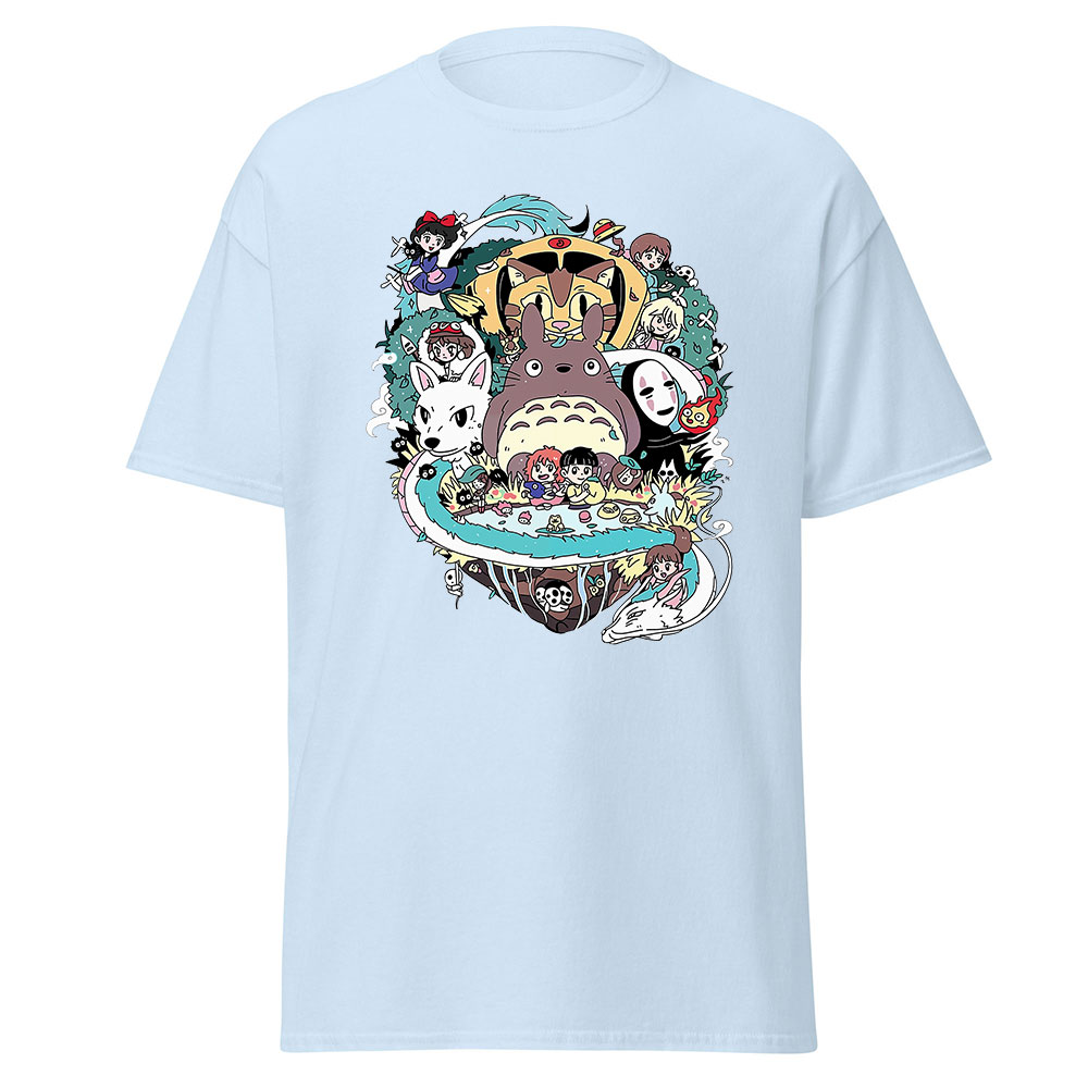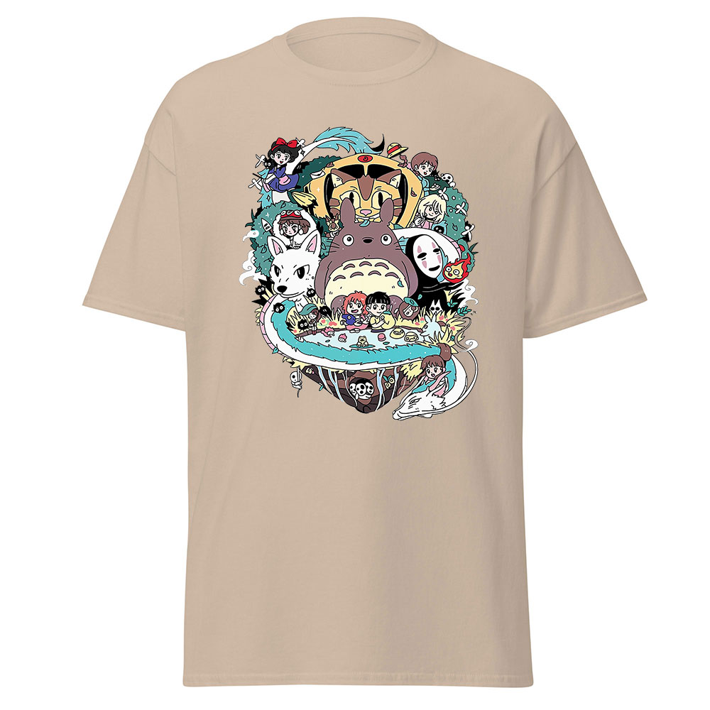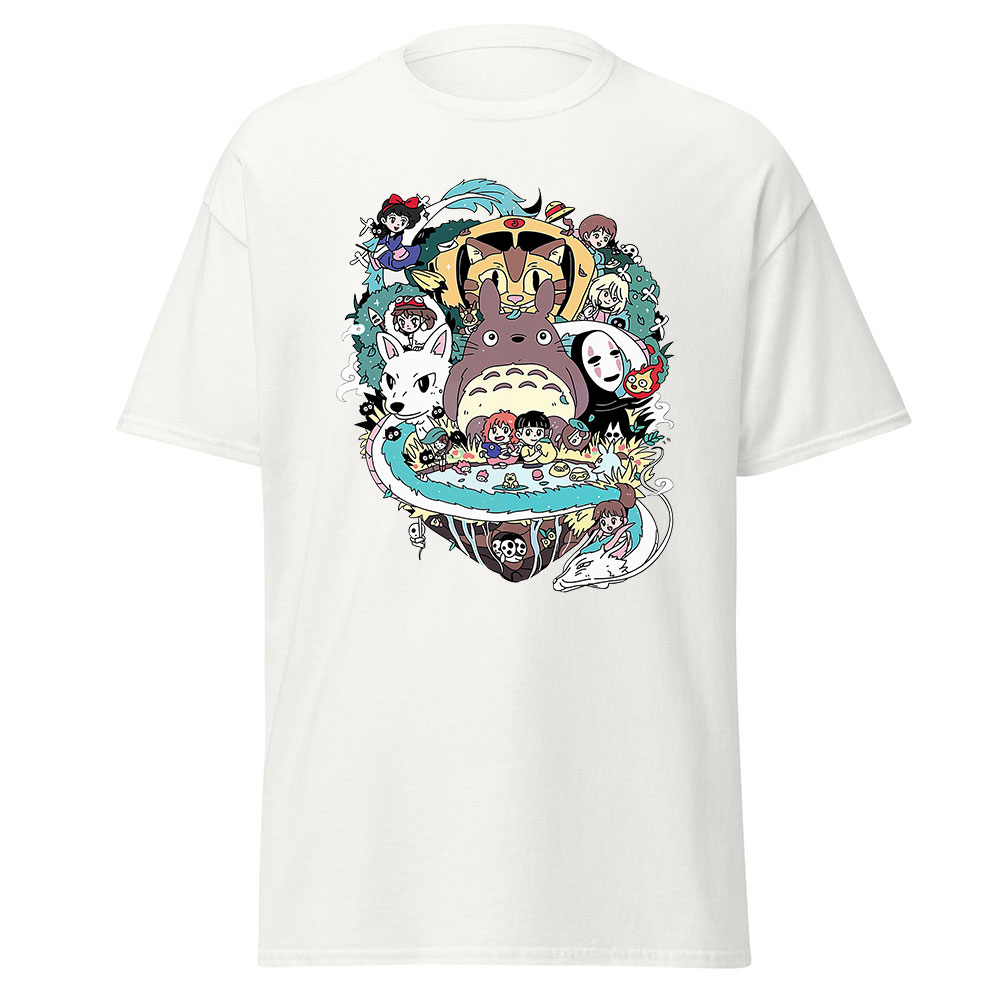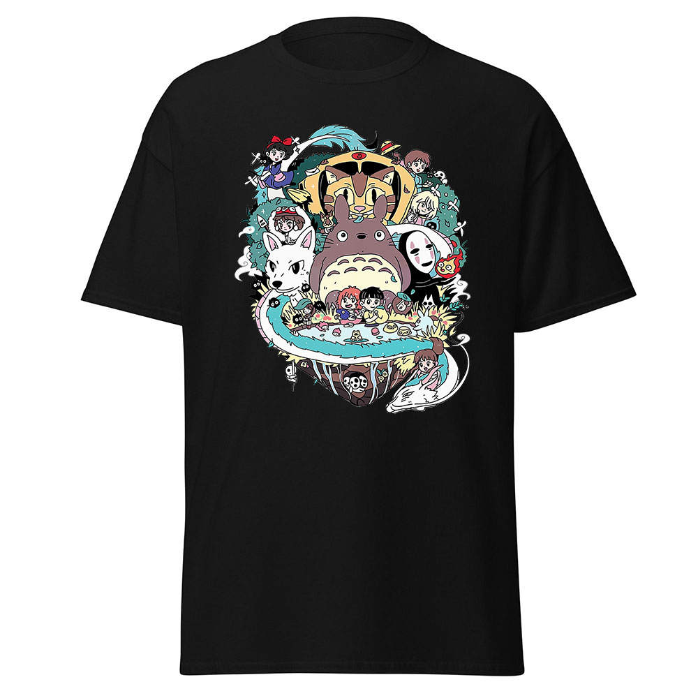A lively collage featuring beloved Studio Ghibli characters gathered in one playful scene. Colorful, detailed, and full of charm, this T-shirt is perfect for true Ghibli fans, designed by Ghibli Nest.