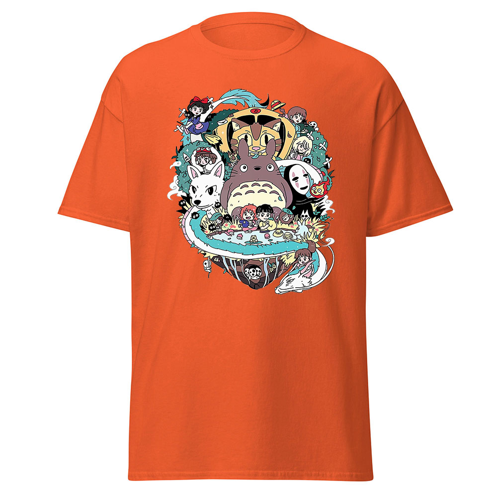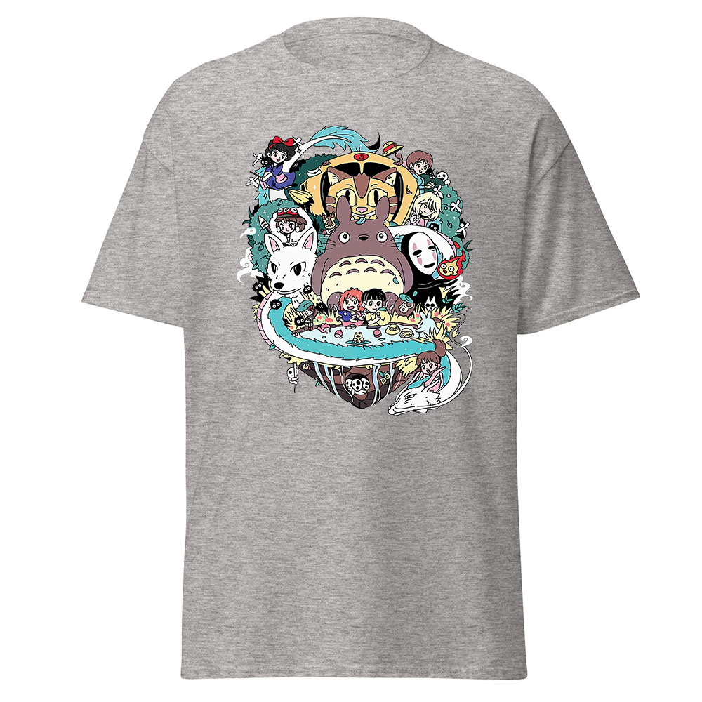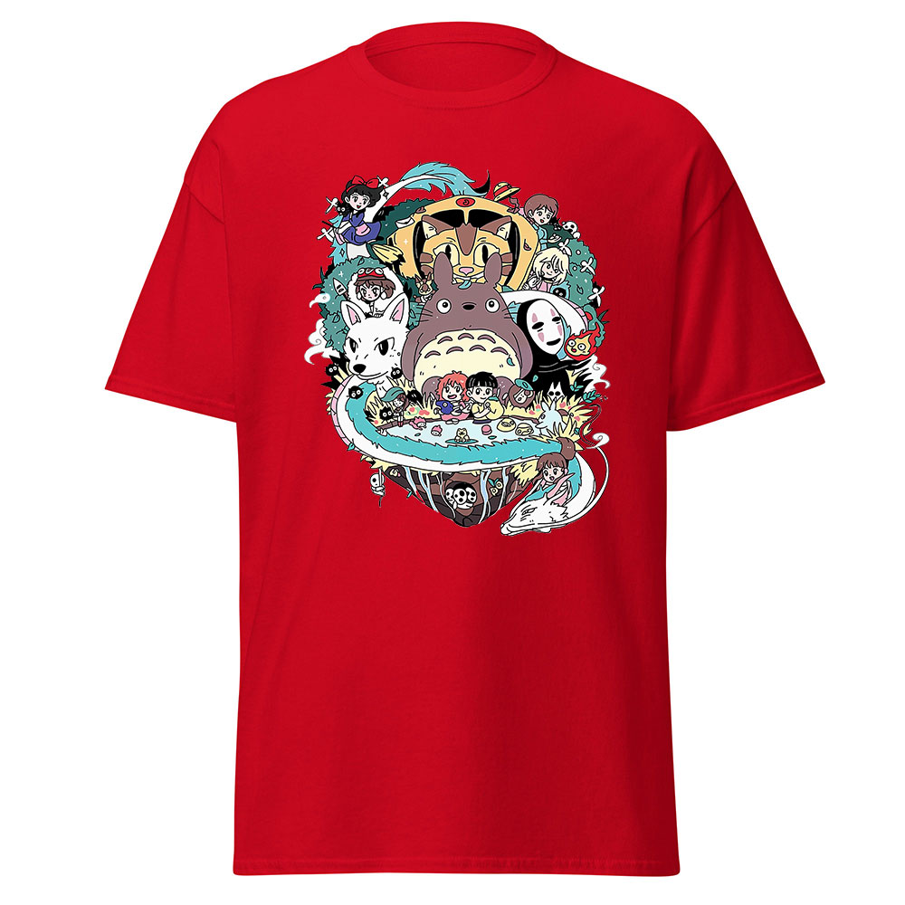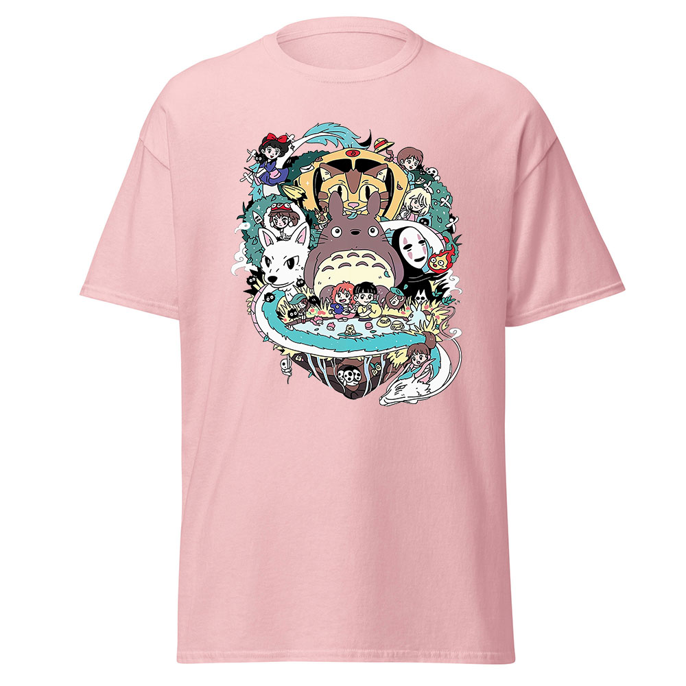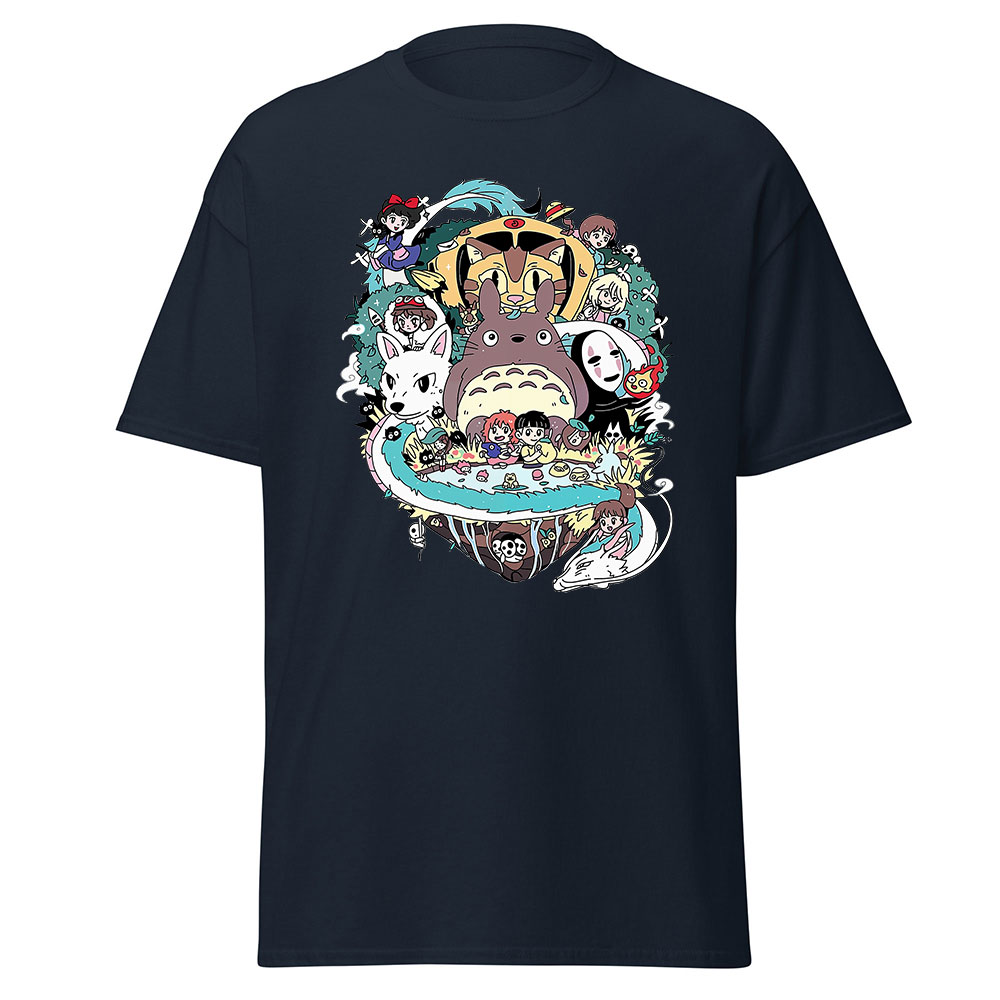 A lively collage featuring beloved Studio Ghibli characters gathered in one playful scene. Colorful, detailed, and full of charm, this T-shirt is perfect for true Ghibli fans, designed by Ghibli Nest.