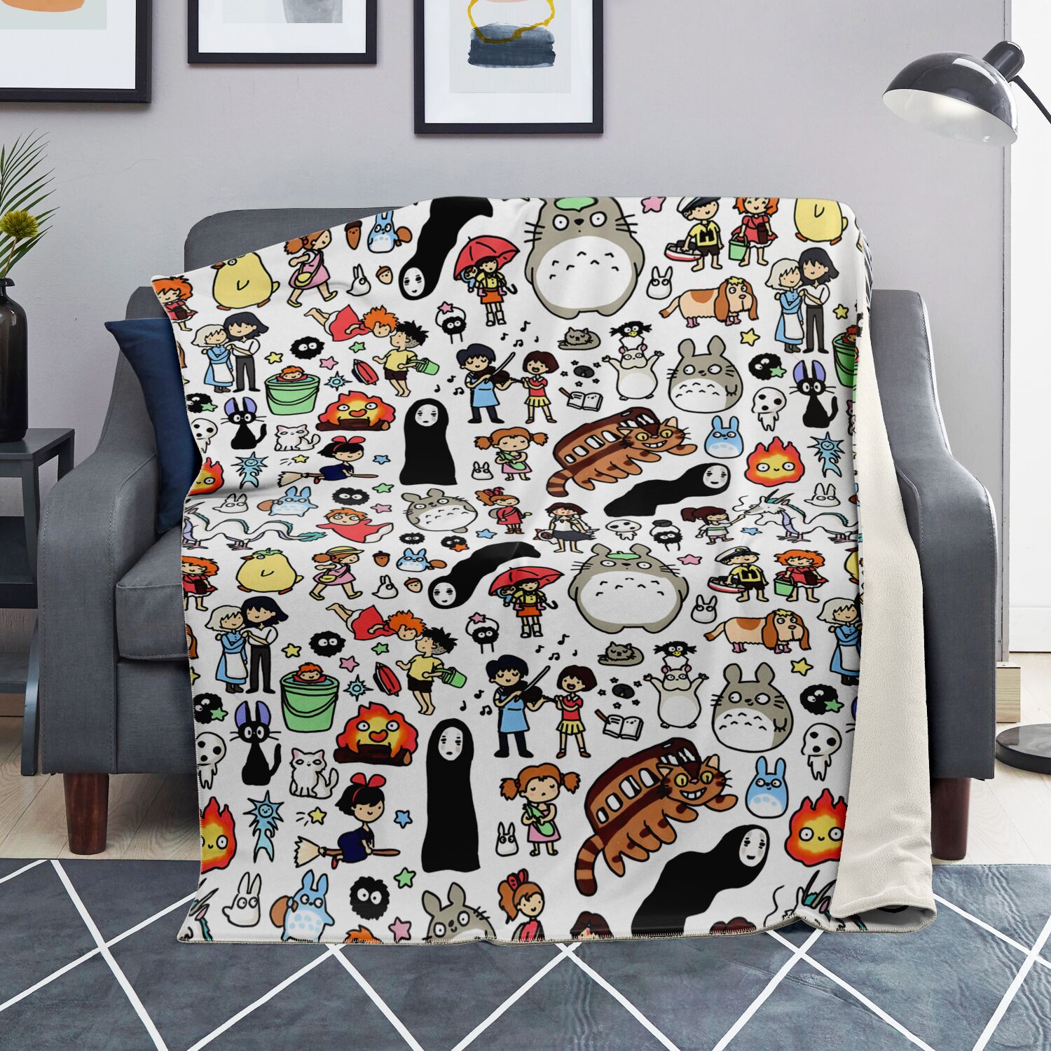 • Theme: Studio Ghibli Full Chibi Doodle Characters All-Over Pattern Sherpa Blanket – Exclusive to Ghibli Nest Store
